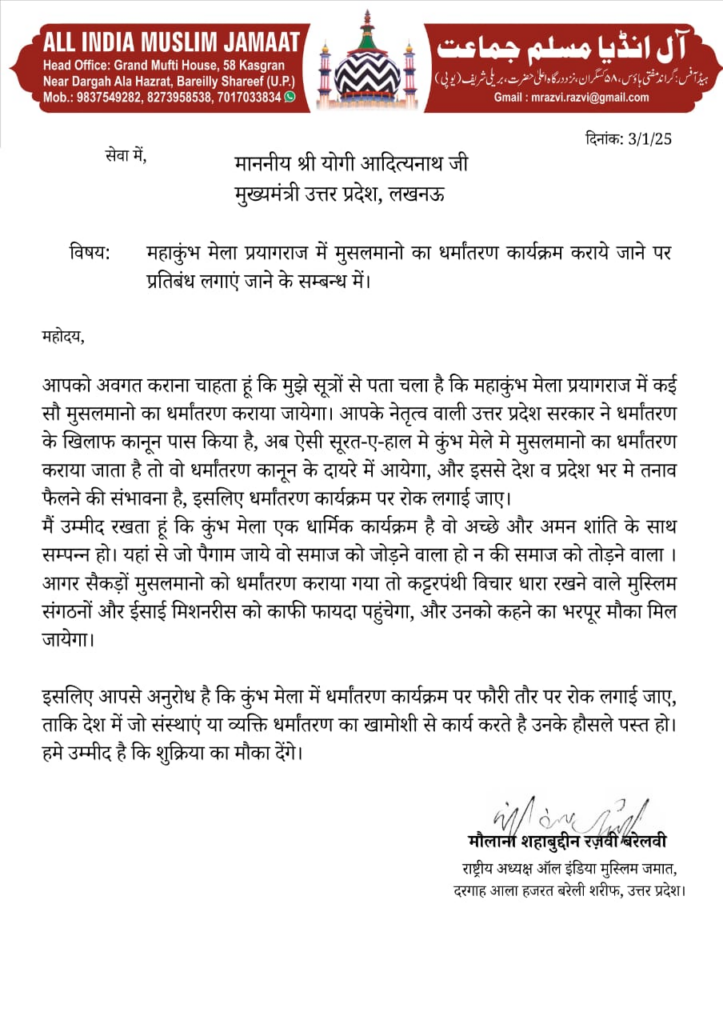 बता दें कि 3 जनवरी को शहाबुद्दीन रजवी की ओर के मुख्यमंत्री योगी आदित्यनाथ को पत्र लिखा गया था. पत्र में उन्होंने अंदेशा जताया था कि प्रयागराज में हो रहे महाकुंभ में कई सौ मुसलमानों का धर्मांतरण कराया जाएगा. धर्मांतरण के खिलाफ कानून को लेकर उन्होंने कहा कि इस धर्मांतरण से पूरे देश और प्रदेश में तनाव बढ़ने की उम्मीद संभावना है. ऐसे में इसे रोका जाए. साथ ही उन्होंने यह भी कहा था कि महाकुंभ मेला एक धार्मिक कार्यक्रम है और अच्छे और अमन शांति के साथ सम्पन्न हो.