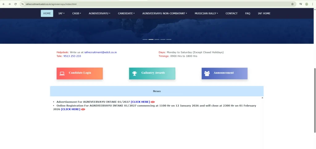 आवेदन करने के लिए, सबसे पहले ऑफिशियल वेबसाइट iafrecruitment.edcil.co.in पर जाएं. होमपेज पर, AGNIVEERVAYU सेक्शन पर क्लिक करें. अनाउंसमेंट पर क्लिक कर न्यूज़ सेक्शन में अग्निवीर वायु INTAKE 01/2027 के लिंक पर क्लिक करें. नए कैंडिडेट “यहां रजिस्टर करें” पर क्लिक करें, अपना नाम, मोबाइल नंबर और ईमेल ID भरें, और OTP का इस्तेमाल करके रजिस्ट्रेशन पूरा करें. इसके बाद, दिए गए यूजर ID और पासवर्ड का इस्तेमाल करके लॉग इन करें, एप्लीकेशन फॉर्म भरें और सभी जरूरी डिटेल्स को ध्यान से देखकर भरें. यह भर्ती युवाओं के लिए एयर फोर्स में करियर बनाने का एक शानदार मौका है.