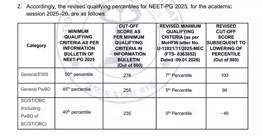 बता दें NBEM ने यह नया कट ऑफ तब जारी किया, जब काउंसलिंग के दूसरे राउंड के बाद 18,000 से ज़्यादा सीटें खाली रह गई. बोर्ड ने क्वालिफाइंग क्राइटेरिया में भारी कमी की और शेड्यूल्ड कास्ट (SC), शेड्यूल्ड ट्राइब (ST) और अन्य पिछड़ा वर्ग (OBC) के कैंडिडेट्स के लिए स्कोर -40/800 तय किया. इसके अलावा जनरल (EWS) कैटेगरी में कट-ऑफ 276 से घटाकर 103 कर दिया गया है, जबकि जनरल-PwBD कैटेगरी में इसे 255 से घटाकर 90 कर दिया गया है.