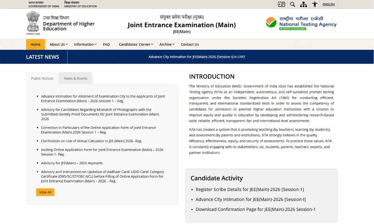 - इसके बाद होम पेज पर दिए गए ‘JEE Main 2026 Exam City Slip’ लिंक पर क्लिक करें.