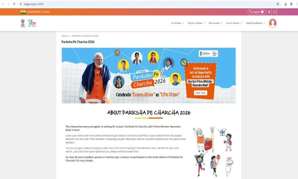 Pariksha pe Charcha 2026: हर साल की तरह इस बार भी प्रधानमंत्री मोदी बच्चों के साथ ‘परीक्षा पे चर्चा’ करेंगे. पीएम मोदी के ‘परीक्षा पे चर्चा’ का नौवां संस्करण आने वाला है, जिसके लिए रजिस्ट्रेशन प्रक्रिया शुरू हो गई है. शिक्षा मंत्रालय के अधिकारियों के अनुसार, प्रधानमंत्री नरेंद्र मोदी की सालाना परीक्षा पे चर्चा का नौवां एडिशन जनवरी 2026 में होगा, जिसके लिए रजिस्ट्रेशन 11 जनवरी तक खुले हैं यानी बच्चे 11 जनवरी तक प्रधानमंत्री से मिलने के लिए रजिस्ट्रेशन करवा सकते हैं.