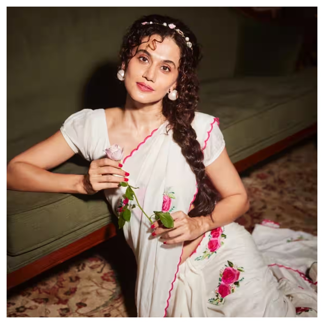 तापसी पन्नू इस ऑफव्हाइट प्रिंटेड साड़ी में बेहद ब्यूटीफुल दिख रही हैं. इसे उन्होंने मैचिंग हाफ स्लीव्स ब्लाउज के साथ कैरी किया. वहीं, मिनिमल मेकअप और मैचिंग टियारा ने तापसी के लुक को और अट्रैक्टिव बनाया.