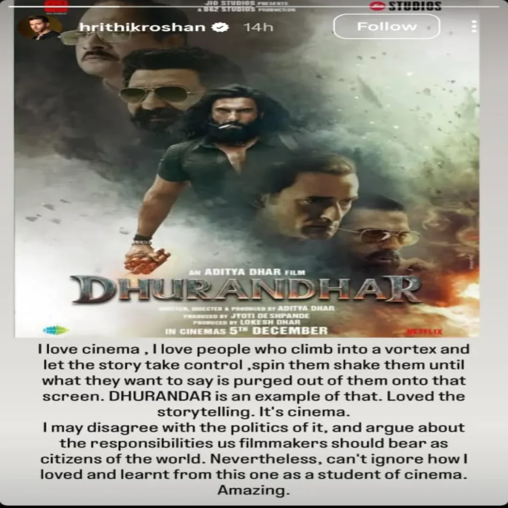ऋतिक रोशन ने अपनी इंस्टाग्राम स्टोरी पर लिखा- ‘मुझे सिनेमा पसंद है, मुझे ऐसे लोग पसंद हैं जो किसी भंवर में फंस जाते हैं और कहानी को कंट्रोल करने देते हैं. उन्हें तब तक घुमाते हैं, हिलाते हैं जब तक कि वे जो कहना चाहते हैं, वह उनसे निकलकर स्क्रीन पर न आ जाए. धुरंधर इसका एक उदाहरण है. कहानी कहने का तरीका बहुत पसंद आया, यह सिनेमा है. ‘ऋतिक ने आगे लिखा- ‘हो सकता है कि मैं इसकी पॉलिटिक्स से सहमत न हूं और इस बारे में बहस करूं कि दुनिया के नागरिक होने के नाते हम फिल्ममेकर्स को क्या ज़िम्मेदारियां निभानी चाहिए. फिर भी मैं इस बात को नजरअंदाज नहीं कर सकता कि सिनेमा के स्टूडेंट के तौर पर मैंने इसे कितना पसंद किया और इससे कितना कुछ सीखा. कमाल की फिल्म है.’