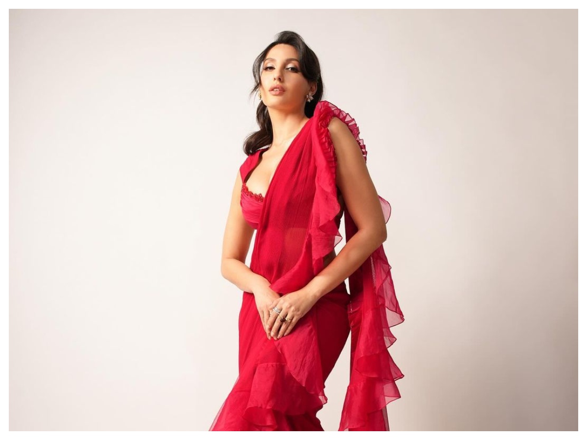 नोरा फतेही लाल रफल साड़ी में बहुत ही प्यारी लग रही हैं। परफेक्ट हेयरस्टाइल और मेकअप के साथ में उन्होंने अपने लुक को परफेक्ट टच दिया।