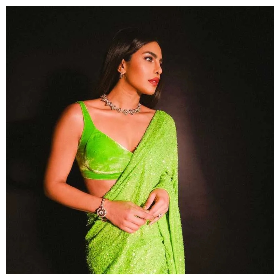 ब्लैक प्रिंटेड साड़ी में प्रियंका के चेहरे से नजरे हटाना मुश्किल है. इस शाइनी साड़ी को उन्होंने हाफ स्लीव्स मैचिंग ब्लाउज के साथ पेयर किया. वहीं, गोल्डन ईयररिंग्स, चेन, ब्लैक चूड़ी, पार्टी मेकअप और खुले बालों ने प्रियंका की खूबसूरती को और बढ़ाया.