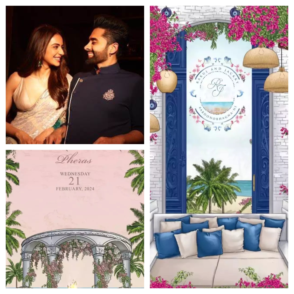 सोशल मीडिया पर रकुल प्रीत सिंह और जैकी भगनानी का वेडिंग कार्ड काफी वायरल हो रहा है। ये वेडिंग कार्ड ब्लू थीम पर है। पिंक कलर के फूल और बैकग्राउंड में समंदर का किनारा कार्ड पर दिखाई दे रहा है। खैर, वेडिंग डेट के बाद अब फैंस इस स्टार कपल के वेडिंग आउटफिट को लेकर भी काफी एक्साइटेड हैं। हालांकि, इस बारे में अभी ऑफिशियल जानकारी नहीं मिल पाई है। लेकिन इतना तय है कि ये कपल भी पॉपुलर सेलिब्रिटी डिजाइनर्स में से किसी एक का बना जोड़ा ही पहनेंगे।