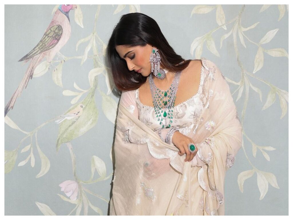 बॉलीवुड एक्ट्रेस सोनम कपूर ने व्हाइट कलर का खूबसूरत लहंगा पहना था। डायमंड जूलरी और मिनिमल मेकअप के साथ एक्ट्रेस ने अपने क्लासी लुक को पूरा किया। फुल स्लीव ब्लाउज और मैचिंग दुपट्टे को सोनम ने रॉयल तरीके से कैरी किया था। खुले बालों ने एक्ट्रेस के लुक में चार चांद लगाने का काम किया।