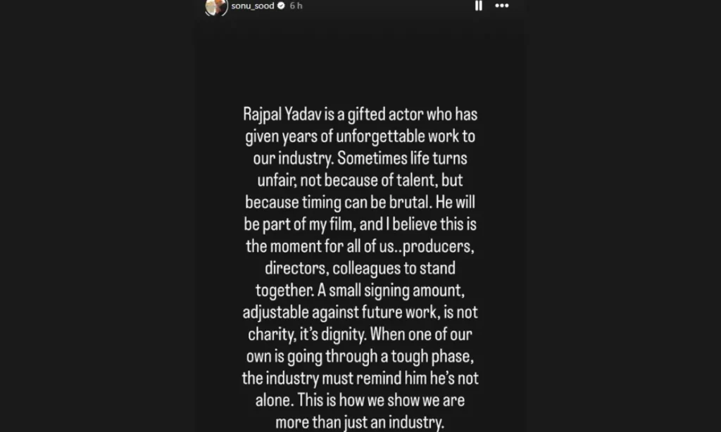 राजपाल यादव की बेबसी को देखते हुए सोनू सूद ने सोशल मीडिया प्लेटफॉर्म पर एक दिल छू लेने वाला पोस्ट लिखा. सोनू ने ये भी अनाउंस किया कि, राजपाल यादव उनकी अगली फिल्म का हिस्सा होंगे और उन्होंने तुरंत उन्हें एक साइनिंग अमाउंट भी ऑफर किया. सोनू ने लिखा कि राजपाल एक बहुत ही टैलेंटेड एक्टर हैं जिन्होंने सालों तक हमें यादगार फिल्में दी हैं. कभी-कभी टैलेंट की कमी से नहीं, बल्कि बुरे वक्त की वजह से जिंदगी नाइंसाफी करती है.