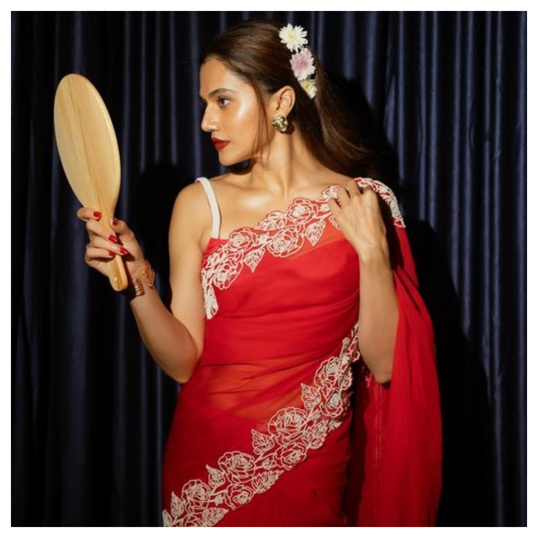 तापसी पन्नू इस रेड कलर की ऑर्गेंजा साड़ी में बेहद हसीन लग रही हैं. फ्लोरल कढ़ाई वाली इस साड़ी को उन्होंने स्ट्रैपी ब्लाउज के साथ पेयर किया. वहीं, हाई हील्स और बालों में लगे फूलों ने तापसी की खूबसूरती को और बढ़ाया.