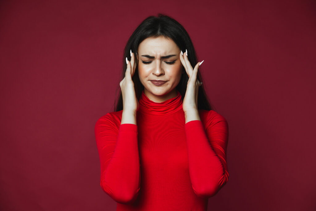 Beautiful brunette caucasian girl dressed in red pullover with painful headache on the pink background