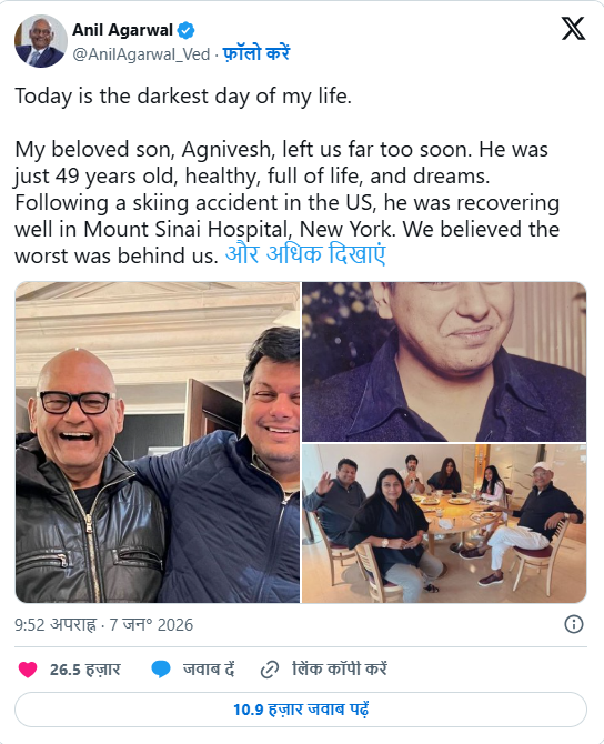 Agnivesh Agarwal Death: Vedanta Group के चेयरमैन अनिल अग्रवाल के बेटे अग्निवेश अग्रवाल का निधन हो गया. वह महज 49 साल के थे. उन्होंने कम उम्र में ही दुनिया को अलविदा कह दिया. बेटे के निधन से पिता पर दुखों का पहाड़ टूट गया. अग्निवेश अमेरिका में कुछ दिनों पहले स्कीइंग के दौरान जख्मी हो गए थे. उनका इलाज न्यूयॉर्क के माउंट सिनाई हॉस्पिटल में चल रहा था. इस बीच कार्डियक अरेस्ट से अग्निवेश ने इस दुनिया को अलविदा कह दिया. बेटे के निधन पर अनिल अग्रवाल ने एक भावुक पोस्ट लिखा है, जिसमें उन्होंने अपना दर्द बयां किया है. उन्होंने लिखा कि एक माता-पिता के दिल के दर्द को शब्दों में बयां नहीं किया जा सकता, जब उन्हें अपने ही बच्चे को अलविदा कहना पड़े. निधन पर पिता अनिल अग्रवाल ने कहा कि बेटे का जाना पिता से पहले नहीं होना चाहिए. बेटे के निधन ने हमें पूरी तरह से तोड़ दिया है.