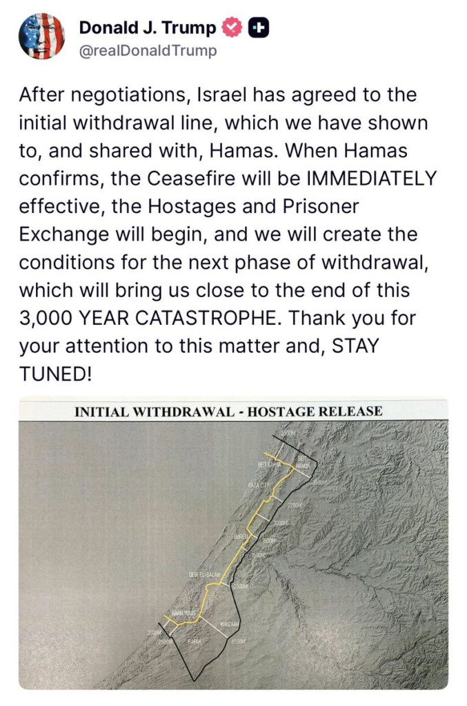 ट्रंप ने अपने सोशल मीडिया प्लेटफॉर्म ट्रुथ सोशल पर लिखा कि इजरायल प्रारंभिक वापसी रेखा पर सहमत हो गया है और प्रस्ताव हमास को भेज दिया गया है. जैसे ही हमास इस पर सहमति देगा, युद्धविराम लागू हो जाएगा, बंधकों की अदला-बदली शुरू होगी और इजरायल की वापसी का अगला चरण तय होगा. उन्होंने लोगों से कहा कि यह दुनिया के लिए एक बड़ा क्षण है और सभी को जुड़े रहना चाहिए.