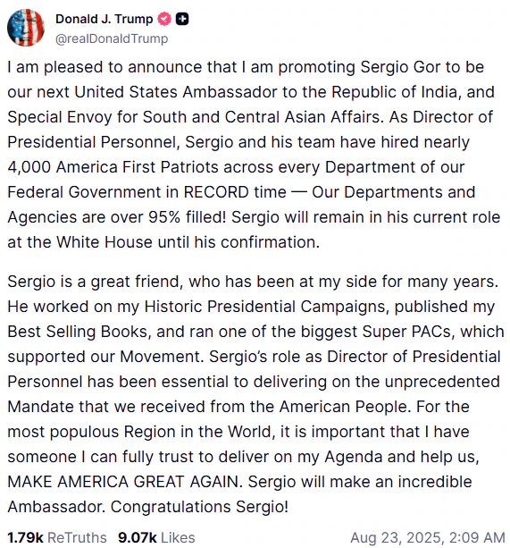 भारत के अगले राजदूत नियुक्त होने के बाद से सर्जियो गोर ने सोशल मीडिया एक्स पर अपनी पहली प्रतिक्रिया देते हुए लिखा कि