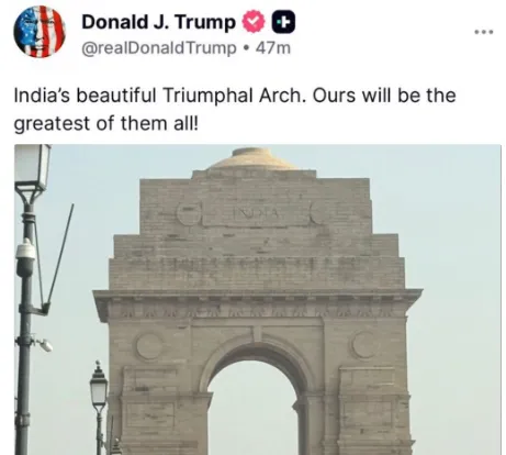 अमेरिकी राष्ट्रपति ने एक्स पर दिल्ली के इंडिया गेट की तस्वीर शेयर की. उन्होंने लिखा, ‘भारत का खूबसूरत विजय मेहराब, हमारा वाला सबसे महान होगा.’ बता दें, एक दिन पहले ट्रंप ने कहा था कि वे आजादी के 250 पूरे होने पर वाशिंगटन डीसी में एक विजय मेहराब बनाना चाहते हैं और यह सबसे बड़ा होगा.
