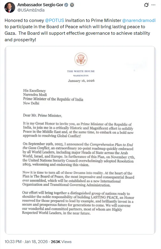 भारत में अमेरिका के राजदूत सर्जियो गोर ने इस निमंत्रण को एक्स पर पोस्ट किया. उन्होंने लिखा कि “प्रधानमंत्री नरेंद्र मोदी को बोर्ड ऑफ़ पीस में हिस्सा लेने के लिए @POTUS की तरफ़ से न्योता देते हुए मुझे गर्व महसूस हो रहा है, जिससे गाज़ा में हमेशा के लिए शांति आएगी. बोर्ड स्थिरता और खुशहाली लाने के लिए असरदार शासन को सपोर्ट करेगा!”