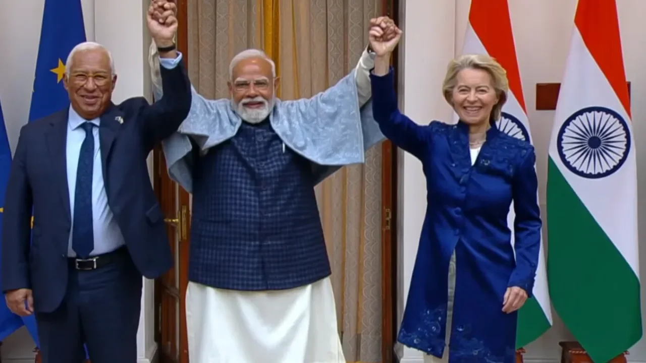 India-EU Trade Agreement: प्रधानमंत्री मोदी ने शिखर वार्ता के लिए ईयू प्रमुख और यूरोपीय परिषद के अध्यक्ष की मेजबानी की. भारत और यूरोपीय संघ के बीच हुए मुक्त व्यापार समझौते (FTA) को यूरोपीय आयोग की अध्यक्ष उर्सुला वॉन डेर लेयेन ने ऐतिहासिक बताया है. वॉन डेर लेयेन ने कहा कि एक सफल भारत दुनिया को अधिक स्थिर, समृद्ध एवं सुरक्षित बनाता है. नई दिल्ली में बहुप्रतीक्षित भारत-ईयू मुक्त व्यापार समझौता एक अत्यधिक महत्वपूर्ण समझौता है जिसे ‘मदर ऑफ ऑल द डील्स’ कहा जा रहा है. इससे दोनों देशों के बीच संबंधों की समग्र दिशा में महत्वपूर्ण विस्तार होने की उम्मीद है क्योंकि यह विविध क्षेत्रों में सहयोग के नए अवसर खोलेगा.भारत और यूरोपीय संघ 2004 से रणनीतिक साझेदार रहे हैं. अधिकारियों ने बताया कि प्रस्तावित सुरक्षा एवं रक्षा साझेदारी (एसडीपी) दोनों पक्षों के बीच रक्षा एवं सुरक्षा सहयोग को और मजबूत करने में सहायक होगी. उर्सुला वॉन डेर लेयेन ने कहा कि इस समझौते के जरिए दो अरब लोगों के लिए एक विशाल मुक्त व्यापार क्षेत्र का निर्माण हुआ है, जिससे दोनों पक्षों को लाभ होगा. मंगलवार सुबह प्रधानमंत्री नरेंद्र मोदी ने यूरोप और अमेरिका के बीच संबंधों में आई नई दरारों के बीच शिखर वार्ता के लिए यूरोपीय आयोग की अध्यक्ष उर्सुला वॉन डेर और यूरोपीय परिषद के अध्यक्ष एंटोनियो कोस्टा का स्वागत किया.