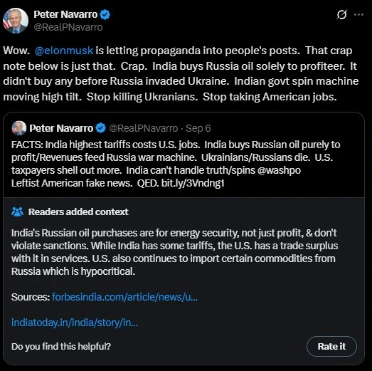 बता दें कि Community नोट में नवारो के दावों को गलत बताया जा रहा है. इसमें कहा गया कि ऊर्जा सुरक्षा के लिए भारत की ओर से रूसी तेल की वैध, संप्रभु खरीद अंतरराष्ट्रीय कानून का उल्लंघन नहीं करती है. अमेरिका, भारत पर दबाव डालते हुए यूरेनियम जैसे अरबों डॉलर के रूसी सामान का आयात जारी रखे हुए है, जो उसके दोहरे मापदंड को स्पष्ट रूप से उजागर करता है. यहां पर बता दें कि एक्स की माने तो Community नोट का मकसद सोशल मीडिया प्लेटफॉर्म पर लोगों को बेहतर informed world बनाना है.