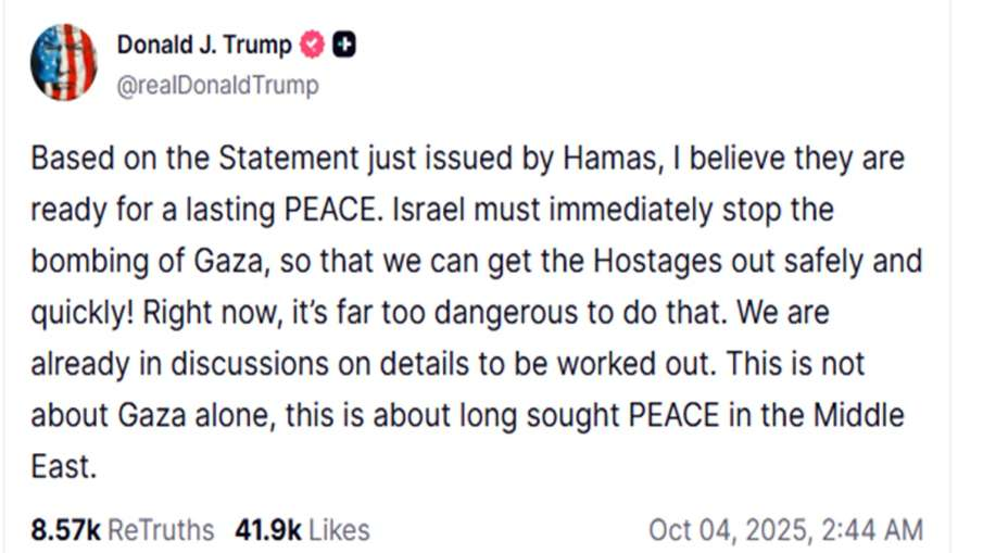 इसे लेकर पीएम मोदी ने सोशल मीडिया प्लेटफॉर्म एक्स पर लिखा कि गाजा में शांति प्रयासों में निर्णायक प्रगति के लिए हम राष्ट्रपति ट्रंप के नेतृत्व का स्वागत करते हैं. बंधकों की रिहाई के संकेत एक महत्वपूर्ण कदम हैं. भारत स्थायी और न्यायसंगत शांति की दिशा में सभी प्रयासों का दृढ़ता से समर्थन करता रहेगा.