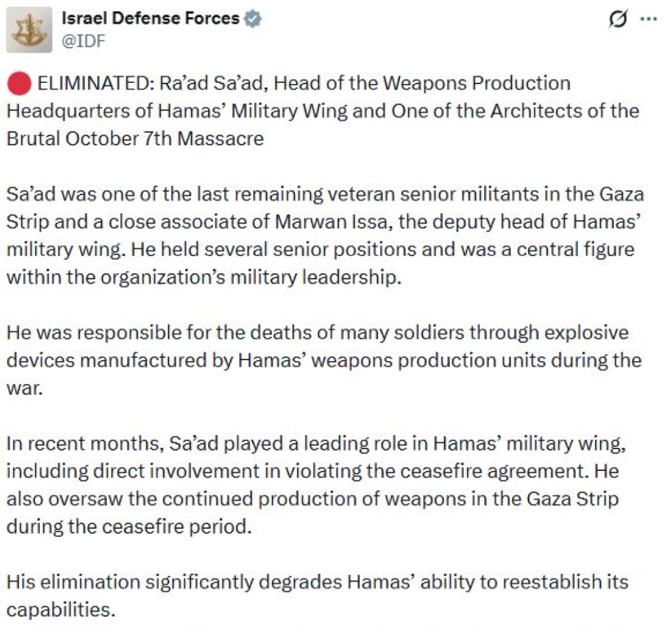 गाजा के स्वास्थ्य अधिकारियों के अनुसार हमले में 4 लोग मारे गए और 25 लोग घायल हुए. हालांकि, हमास या चिकित्सा कर्मियों की ओर से राएद की मौत की तत्काल पुष्टि नहीं की गई है. इस्राइली सेना ने केवल इतना कहा कि उसने गाजा सिटी में एक वरिष्ठ हमास कमांडर को निशाना बनाया था, लेकिन नाम नहीं बताया. राएद की मौत की पुष्टि होती है तो अक्तूबर में लागू हुए संघर्ष विराम के बाद यह हमास के किसी वरिष्ठ नेता का सबसे बड़ा निशाना होगा. इस्राइली रक्षा अधिकारी ने राएद को हमास की हथियार निर्माण इकाई का प्रमुख बताया है, जबकि हमास के सूत्रों ने उसे समूह की सशस्त्र इकाई में इज्जेदीन अल-हद्दाद के बाद दूसरे-इन-कमांड के रूप में बताया था. यह हमला उस समय हुआ है, जब अक्तूबर में हुए संघर्ष विराम के बावजूद गाजा में हिंसा पूरी तरह खत्म नहीं हुई है. गाजा स्वास्थ्य अधिकारियों के अनुसार, इस संघर्ष विराम के बाद से इजरायली बलों के हमलों में 386 फलस्तीनी मारे गए हैं.