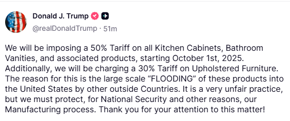 इस मुद्दे पर ध्यान देने के लिए आपका धन्यवाद. हालांकि, उन्होंने अपने दूसरे पोस्ट में कहा कि 1 अक्टूबर से सभी किचन कैबिनेट्स, बाथरूम वैनिटीज और इससे जुड़े प्रोडक्ट्स पर 50 प्रतिशत टैरिफ लगाएंगे. इसके अतिरिक्त, फर्नीचर पर 30 प्रतिशत शुल्क लगाया जाएगा. इसका सबसे महत्वपूर्ण कारण हैं कि दूसरे देश ऐसे प्रोडक्ट्स अमेरिका में भारी मात्रा में भेज रहे हैं. यह उचित तो नहीं है, लेकिन हमें राष्ट्रीय सुरक्षा के लिए ऐसा करना पड़ेगा.