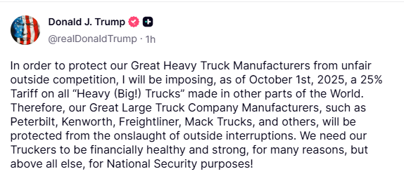 इतना ही ट्रंप ने भारी ट्रकों को लेकर भी बड़ा एलान किया है. उन्होंने भारी ट्रकों पर 25 फीसदी का आयात शुल्क लगाने की घोषणा की है. उन्होंने कहा कि हमारे बड़े भारी ट्रक निर्माताओं को बेवजह की बाहरी प्रतिस्पर्धा से बचाने के लिए मैं 1 अक्टूबर, 2025 से दुनिया के अन्य हिस्सों में निर्मित सभी भारी ट्रकों पर 25% टैरिफ लगा रहा हूं. ऐसा करने से हमारे बड़े ट्रक कंपनी निर्माता जैसे कि पीटरबिल्ट, केनवर्थ, फ्रेटलाइनर, मैक ट्रक्स, और अन्य, बाहरी व्यवधानों के हमले से सुरक्षित रहेंगे. हमें अपने ट्रक चालकों को आर्थिक रूप से स्वस्थ और मजबूत बनाने की आवश्यकता है.