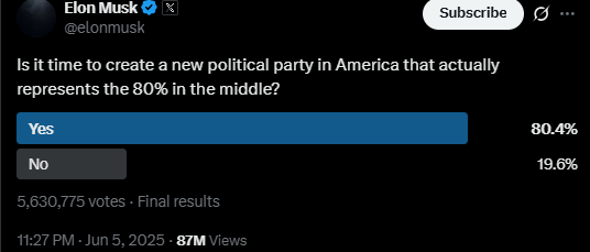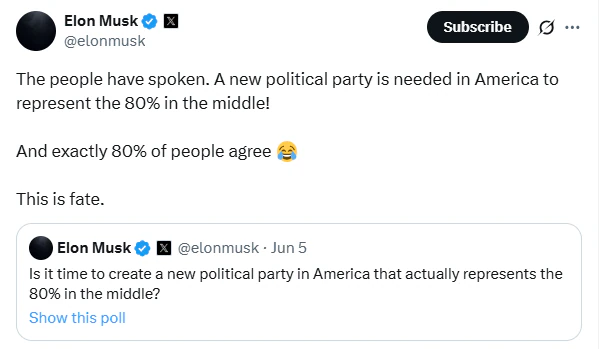 एलन मस्क ने सोशल मीडिया अकांउट एक्स पर एक पोस्ट शेयर किया है जिसमें उन्होंने अमेरिका में नई पार्टी को बनाने को लेकर एक पोल शेयर किया था जिसमें मस्क ने पूछा था कि अमेरिका में नया राजनीतिक दल बनाना चाहिए या नहीं. इसमें उन्हें 80 प्रतिशत लोगों का साथ मिला है. इस दौरान उन्होंने लिखा कि जनती ने अपना फैसला सुना दिया है. अमेरिका में एक नए राजनीतिक दल की जरूरत है, जो 80 प्रतिशत लोगों का प्रतिनिधित्व करें. यही नियति है. इसके बाद से उन्होंने एक और पोस्ट शेयर किया जिसमें उन्होंने लिखा कि ‘The America Party’.