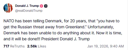 ट्रंप ने ट्रूथ सोशल मीडिया पर प्लेटफॉर्म पर लिखा, ” NATO 20 साल से डेनमार्क से कह रहा है कि तुम्हें ग्रीनलैंड से रूसी खतरे को दूर करना होगा.” बदकिस्मती से, डेनमार्क इस बारे में कुछ नहीं कर पाया है. अब समय आ गया है और यह हो जाएगा!!!”