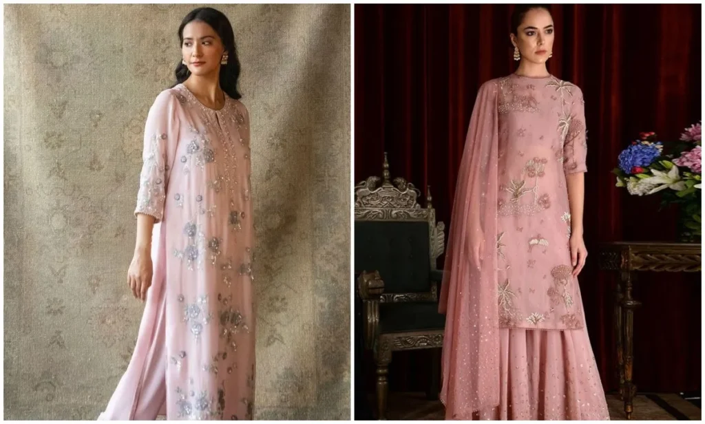 बारीक थ्रेडवर्क और वाइड प्लाज़ो के साथ ये जॉर्जेट कुर्ता सेट एक स्लीक और क्लासी अपील देता है. ऑफिस पार्टी से लेकर फैमिली डिनर तक के लिए ये सूट फिट रहता है. क्लच और स्लिप-ऑन हील्स के साथ आप इस लुक को कंप्लीट कर सकती हैं.