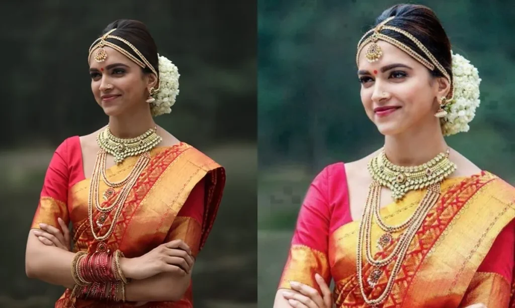 दीपिका पादुकोण हर फिल्म में अपने लुक के साथ एक्सपेरिमेंट करती हैं. ‘चेन्नई एक्सप्रेस’ में उनके क्लासिक साउथ इंडियन ब्राइडल लुक ने कांजीवरम साड़ियों का क्रेज बढ़ा दिया था. रेड साड़ी और माथापट्टी ने उनके लुक में चार चांद लगा दिए थे. अगर आप अपनी शादी में ट्रेडिशनल लुक चाहती हैं, तो बनारसी या कांजीवरम सिल्क साड़ी के साथ दीपिका जैसा ट्रेडिशनल अवतार अपना सकती हैं.