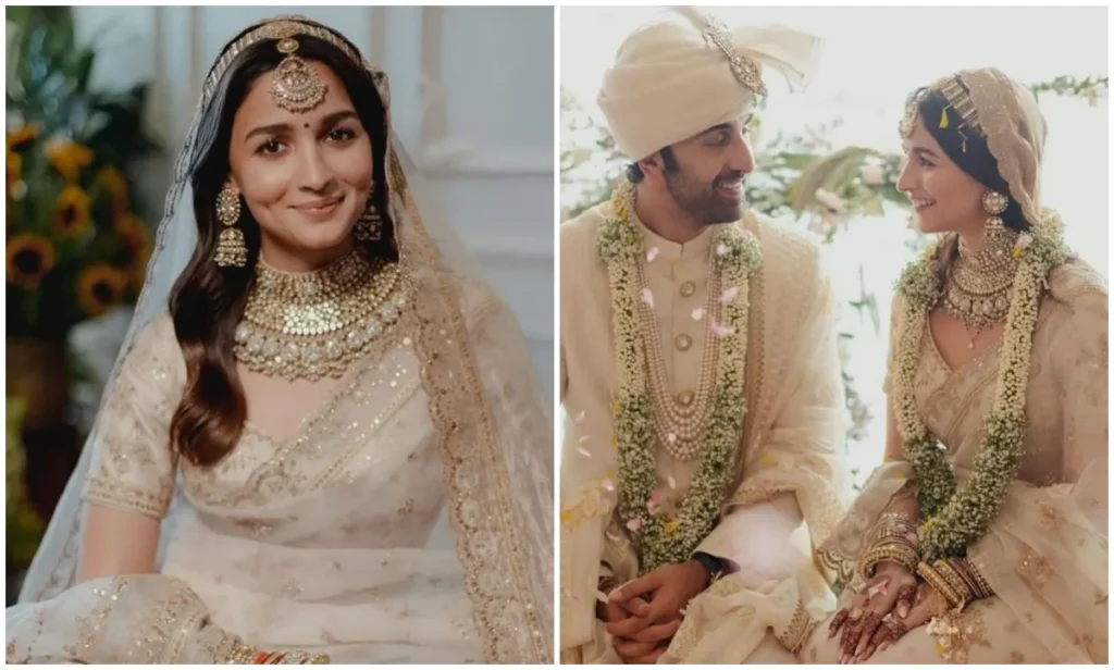 आलिया भट्ट ने अपनी शादी में आइवरी कलर की ऑर्गेंज़ा साड़ी पहनकर हर किसी का दिल जीत लिया. उनकी साड़ी पर गोल्डन धागों से कढ़ाई की गई थी. जूलरी के लिए एक्ट्रेस ने अपना पर्सनल कलेक्शन चुना. इसके अलावा लाइट मेकअप और खुले बालों के साथ अपने सिंपल लेकिन ब्यूटीफुल ब्राइड लुक को परफेक्ट टच दिया.