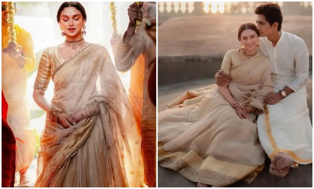 अदिति राव हैदरी ने अपने खास दिन पर बेज रंग की बनारसी साड़ी को चुना. गोल्डन जरी बॉर्डर वाले आउटफिट के साथ अदिति ने एंटीक झुमके पहने, जिनेहोंने उनके ब्राइडल लुक को रॉयल टच दिया. लाइट मेकअप और सिंपल हेयरस्टाइल ने उन्हें बॉलीवुड की सबसे खूबसूरत ब्राइड्स की लिस्ट में खड़ा किया.