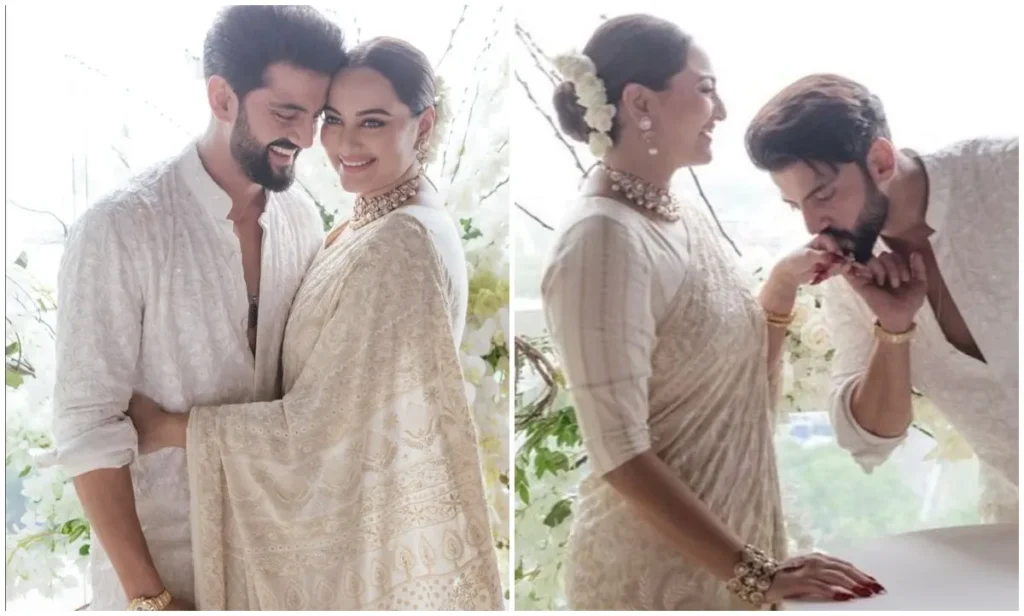 सोनाक्षी सिन्हा ने भी शादी के लिए अपनी मां की साड़ी को चुना. उन्होंने ऑफ व्हाइट साड़ी को पोल्की जूलरी और हाथों में लाल आलता लगाकर स्टाइल किया. सोनाक्षी के इस लुक ने पुराने जमाने की याद दिलाई. हल्के मेकअप और सिंपल हेयरस्टाइल ने एक्ट्रेस के वेडिंग लुक को और ज्यादा रियल और खूबसूरत बनाया.