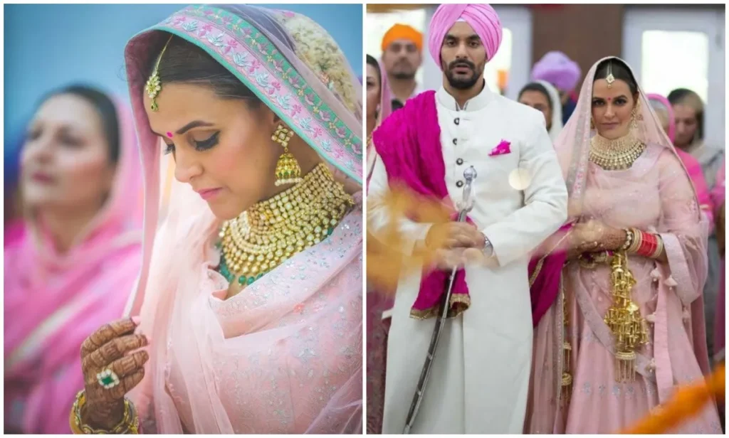 नेहा धूपिया ने अंगद बेदी के साथ अपनी वेडिंग के दिन ब्लश पिंक कलर का सिंपल लहंगा पहना, जिसपर गोटा पट्टी का काम था. मल्टी लेयर्ड नेकलेस और मांग टीके ने उनका लुक कम्पलीट किया. मिनिमल मेकअप और न्यूड लिप्स के साथ एक्ट्रेस ने अपना लुक कंप्लीट किया.