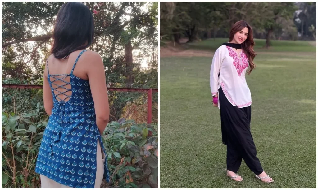 अगर आपको ट्रेडिशनल के साथ साथ थोड़ा मॉडर्न ट्विस्ट चाहिए, तो स्लिट कट या फ्रंट नॉट डिज़ाइन वाली शॉर्ट कुर्ती भी पहन सकती हैं. इस तरह की कुर्ती पार्टी, ब्रंच या फ्रेंड्स डे आउट के लिए बेस्ट ऑप्शन है.