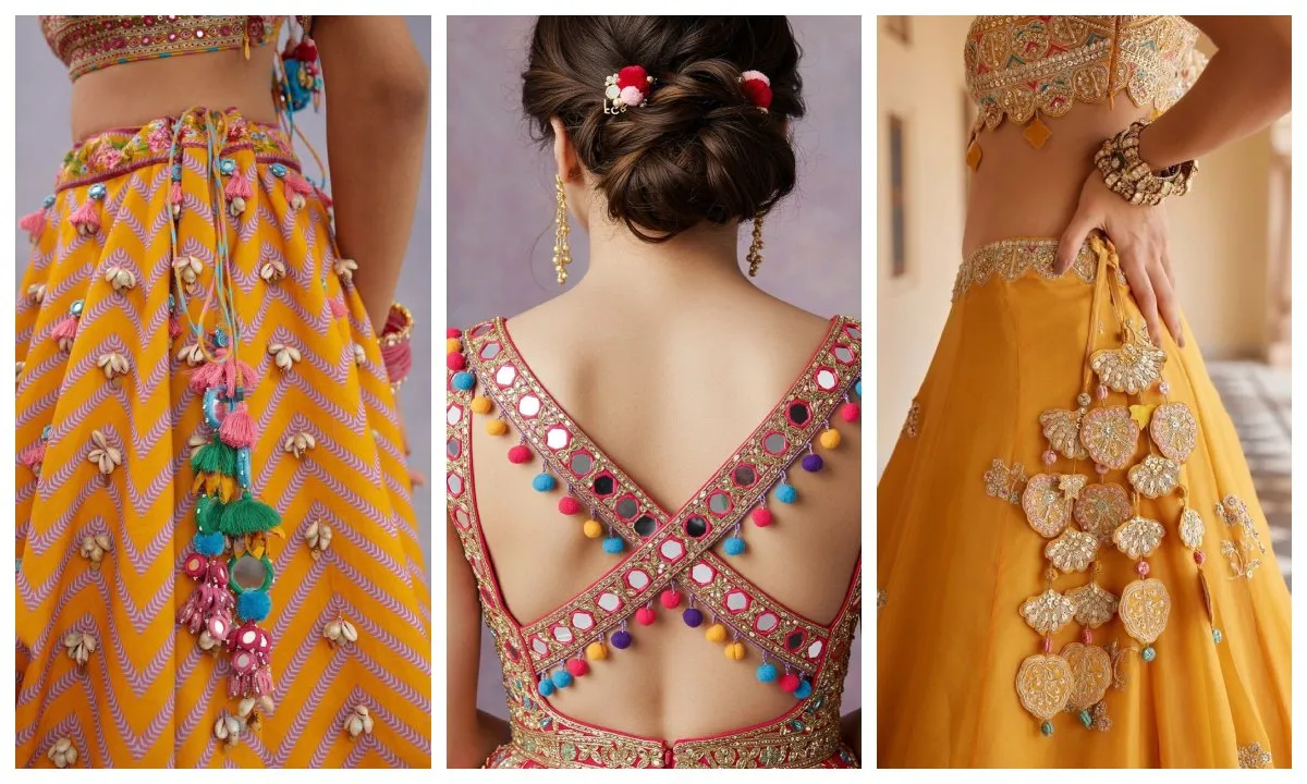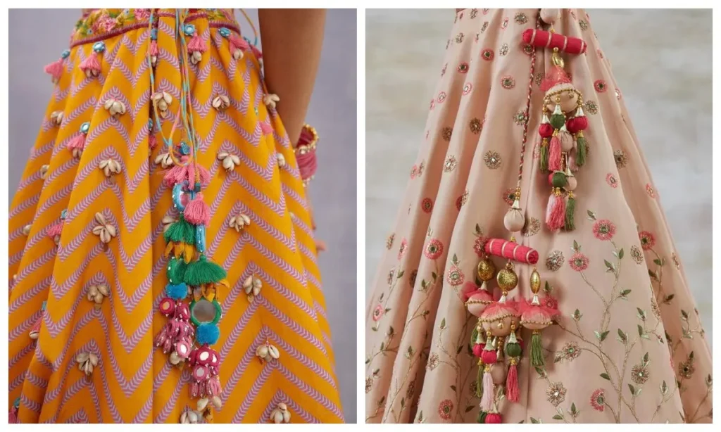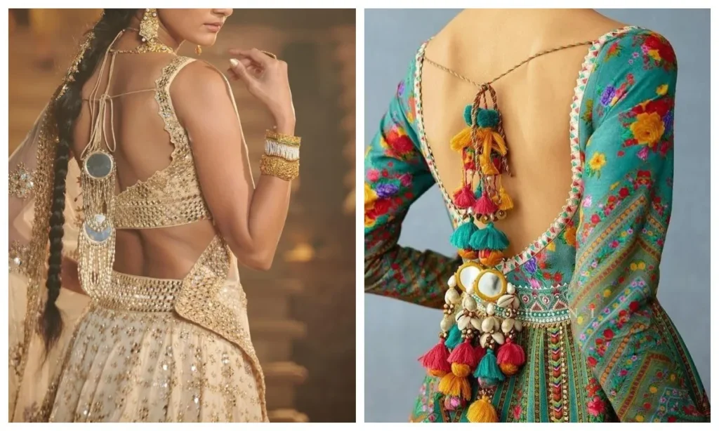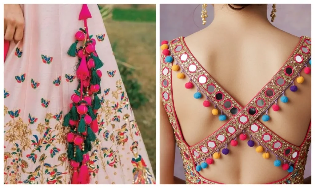 लंबे-लंबे रंग-बिरंगे टसल्स वाली लटकन डोरी आजकल काफी ट्रेंड में है. ये स्टाइल स्पेशियली बैकलेस ब्लाउज़ और फ्लोई लहंगे के साथ बहुत ज्यादा खूबसूरत लगता है.