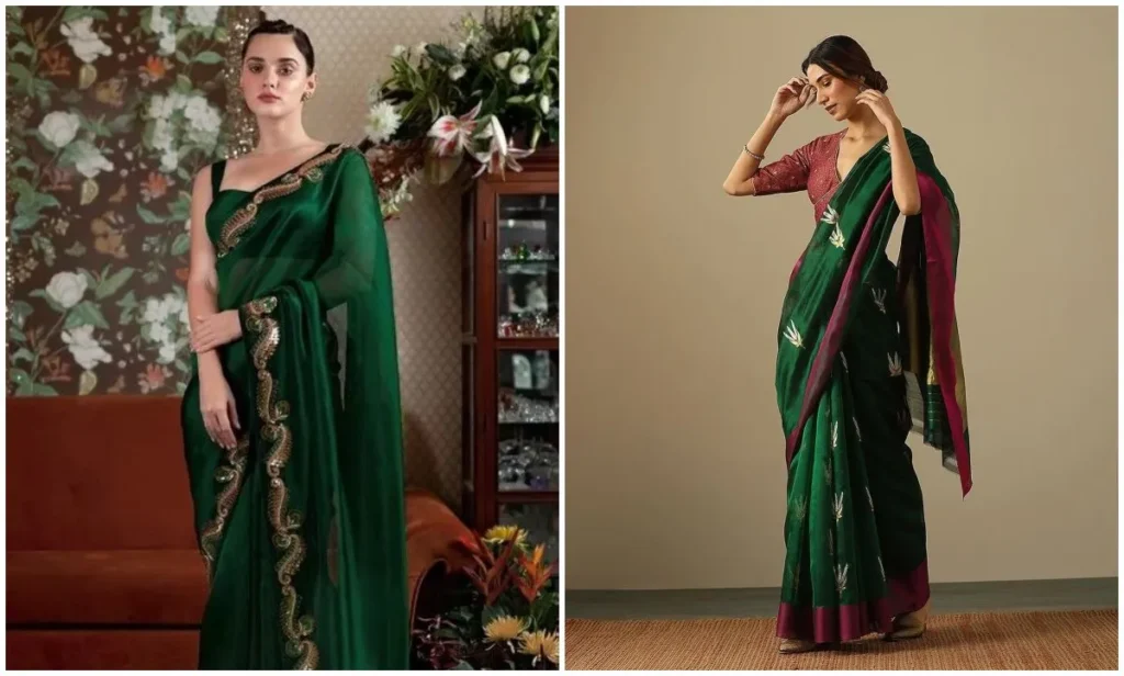 हरा रंग प्रोग्रेस और प्रोसपेरिटी का प्रतीक माना जाता है. आप लाइटवेट ग्रीन कलर की जॉर्जेट या चंदेरी साड़ी का ऑप्शन भी चुन सकती हैं. गोल्डन जरी का बॉर्डर के साथ ये साड़ी आपके लुक को रॉयल और एथनिक दोनों का कॉम्बिनेशन देगी.