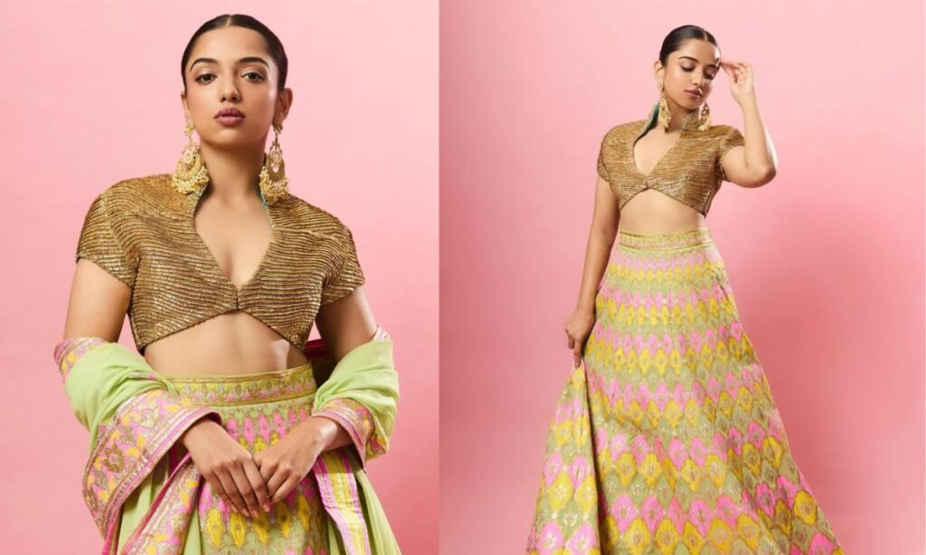 अहसास चन्ना ने नियॉन कलर के लहंगे के साथ कॉलर ब्लाउज डिजाइन को कैरी किया. इस तरह के ब्लाउज आपको एलिगेंट लुक देने में मदद करते हैं. स्लीम गर्ल्स पर इस तरह के ब्लाउज अलग ही लुक देते हैं.