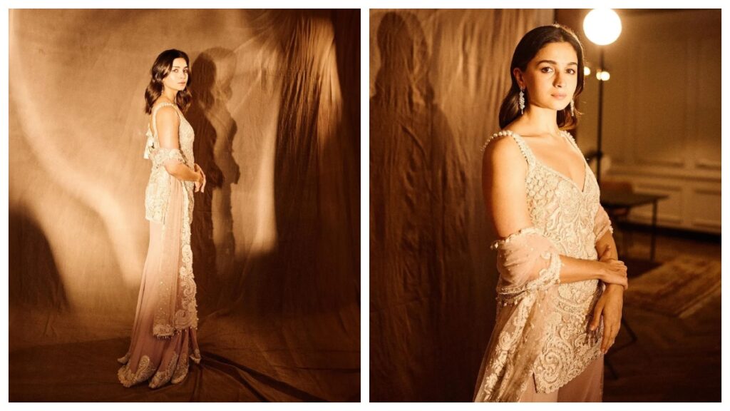 अगर आप किसी शादी समारोह में शरारा सूट लुक कैरी करने का प्लान कर रही हैं तो आप आलिया भट्ट के कढ़ाई वाले शरारा लुक से इन्सपिरेशन ले सकती हैं. उन्होंने यह पेस्टल शरारा कुर्ता सेट चुना है, जिसमें कॉलर वाला छोटा कुर्ता हैली कढ़ाई वाला शरारा है. उन्होंने अपने लुक को नेट के दुपट्टे से मैच किया है.
