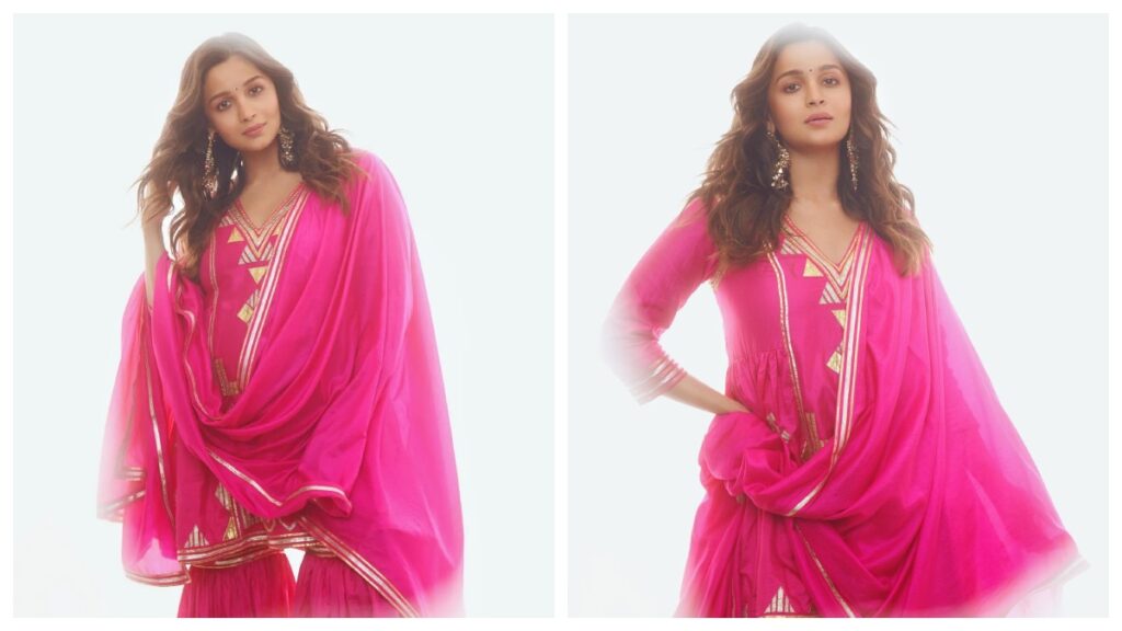 अपनी प्रेग्नेंसी के दौरान आलिया भट्ट ने पिंक शरारा सूट पहना था जिसमें कुर्ता और गोल्डन बॉर्डर पर एक ज्यामितीय डिजाइन है. उन्होंने अपने लुक को सॉलिड पिंक शरारा और मैचिंग दुपट्टे के साथ मैच किया है, जिसमें गोल्डन बॉर्डर है. आलिया ने अपने लुक को गोल्डन इयररिंग्स और बिंदी से पूरा किया.