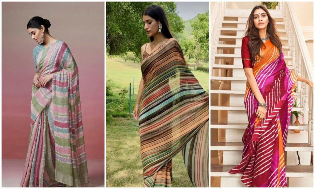 रंग बिरंगी धारियों वाली ये साड़ियां बहुत स्टाइलिश लगती हैं. स्लिम लुक के लिए ये साड़ियां परफेक्ट मानी जाती हैं. इन्हें आप बेल्ट के साथ स्टाइल करे फ्यूजन क्रिएट कर सकती हैं.