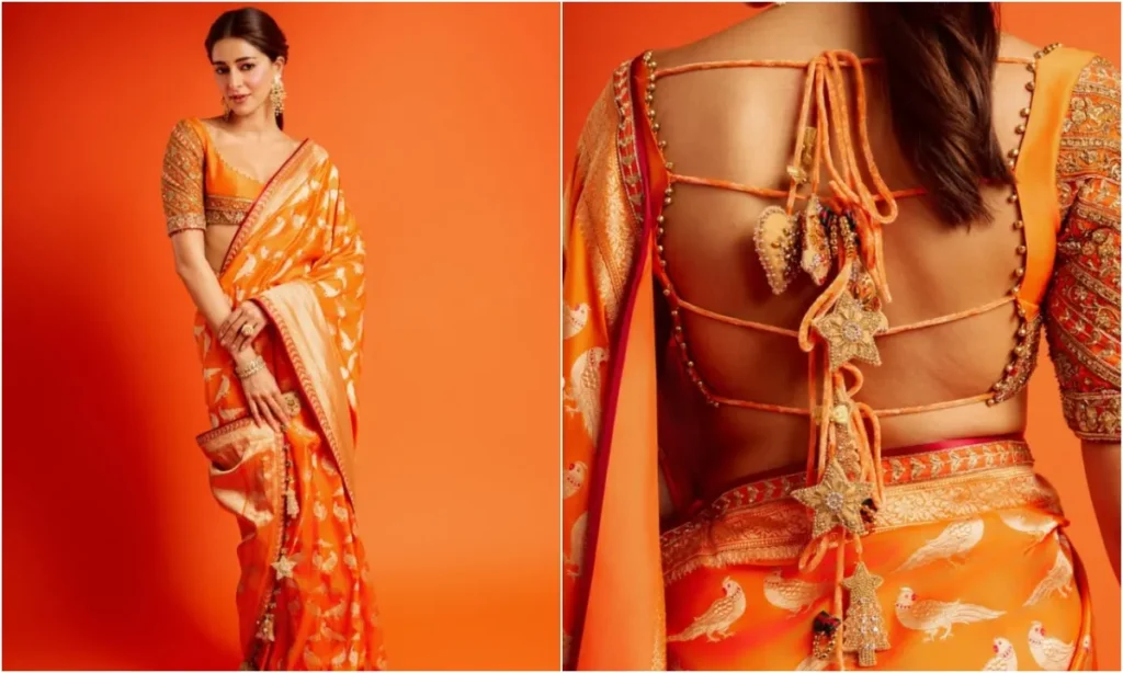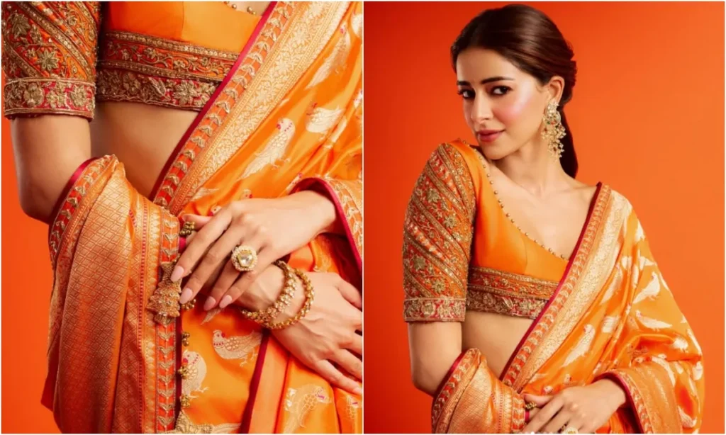अनन्या की ये कस्टम-डिज़ाइन साड़ी सच में हाइलाइट थी. शाइनी ऑरेंज कलर पर उभरे मेटैलिक मोटिफ हर कदम पर ऐसे चमक रहे थे जैसे बुनाई में लौ झिलमिला रही हो. साड़ी का बॉर्डर, टेक्सचर और शाइन इतनी खूबसूरती से उभरी हुई थी कि साफ पता चलता था कि ये सिर्फ एक आउटफिट नहीं, बल्कि बनारसी हुनर की कहानी है. साड़ी के साथ उनका बैकलेस ब्लाउज़ भी खास था. क्रिसमस-इंस्पायर्ड डोरीज़ इसे फेस्टिव रेडी बना रही थीं. ट्रेडिशनल और मॉडर्न डिटेलिंग का ये मिक्स अनन्या के स्टाइल सेंस को और निखार रहा था.