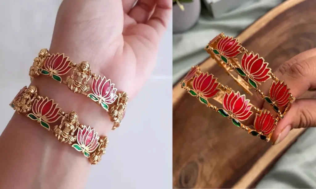 यह मीनाक्षी डिजाइन के कड़े बहुत सिंपल और क्लासी लग रहे हैं. इसमें गुलाबी कलर के कमल के फूल बहुत ही प्यारे लग रहे हैं. अगर आपको भारी कड़े पहनना नहीं पसंद तो आप ऐसे सिंपल कड़े भी पहन सकती हैं. यह आपको रिच लुक देंगे. यह कड़े सभी तरह के सूट पर बहुत प्यारे लगेंगे.