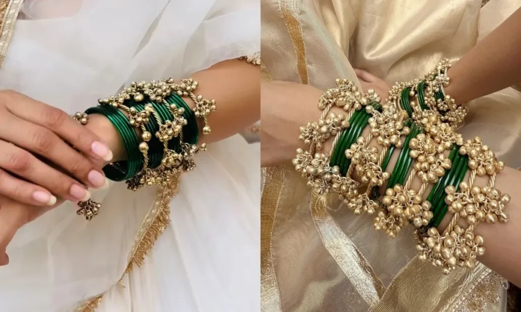 हरे कांच की सिंपल और प्लेन चूड़ियों के साथ इस तरह के गोल्डन घुंघरू वाले कड़े बहुत ही ज्यादा खूबसूरत लग रहे हैं. आप अपनी सिल्क साड़ी या हैवी सूट के साथ इस तरह का बैंगल सेट ट्राई करके देख सकती हैं.