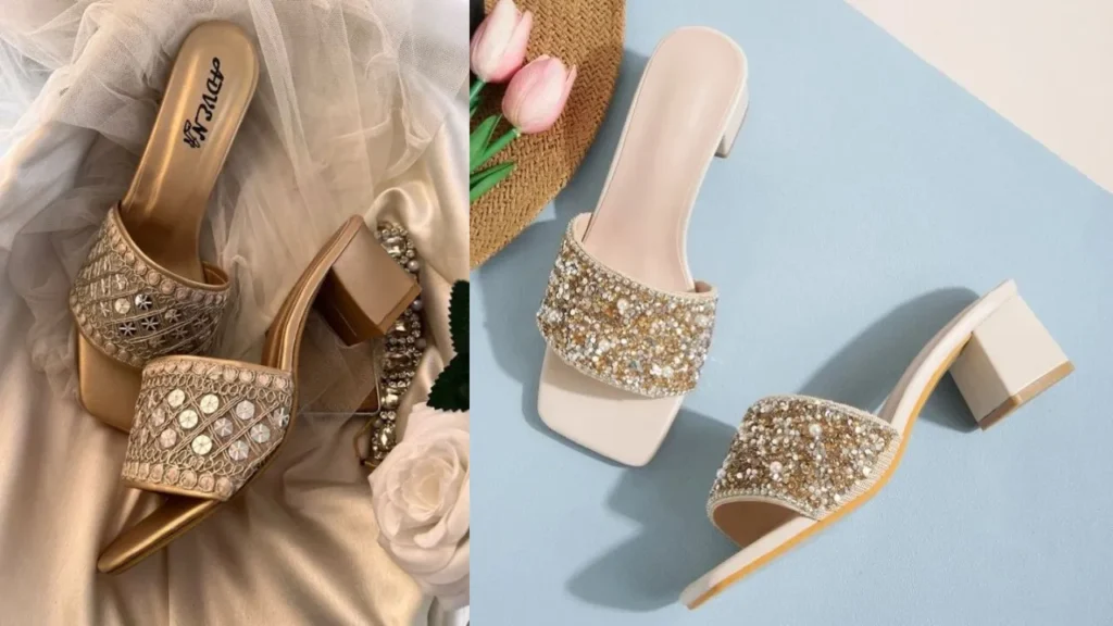 ब्लॉक हील्स आजकल ट्रेंड में हैं. इसके आगे का स्ट्रेट कट डिजाइन बहुत प्यारा लगता है. शादियों में पहनने के लिए इसके स्ट्रैप पर मोतियों की कढ़ाई की गई है, जो बहुत ही एलिगेंट लग रही है. यह हील्स भी साड़ी हो या सूट सभी पर बहुत सुंदर दिखेंगी. कम हाइट होने की वजह से यह कम्फर्टेबल भी हैं.