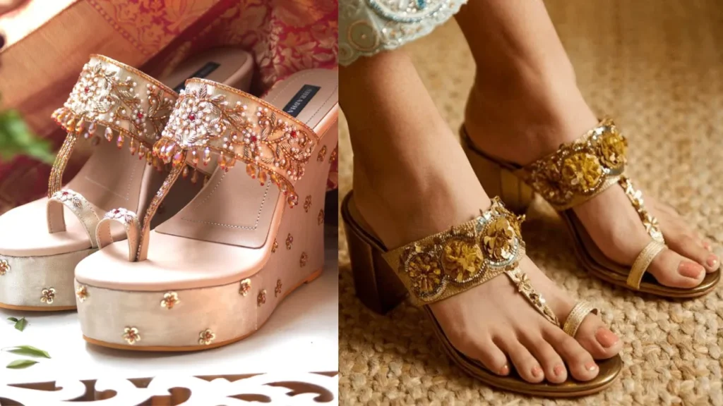 कोलापुरी स्टाइल की ये हील्स आपको इंडियन लुक देंगी. कोलापुरी स्टाइल शादियों में पहनने के लिए बेस्ट हैं, क्योंकि ये सभी तरह की एथनिक ड्रेस पर सुंदर लगेंगी. शादी की चमक-धमक से मैच करने के लिए इस पर मोतियों के साथ डिजाइन बनाया गया है, जो बहुत यूनीक और स्टाइलिश लग रहा है.
