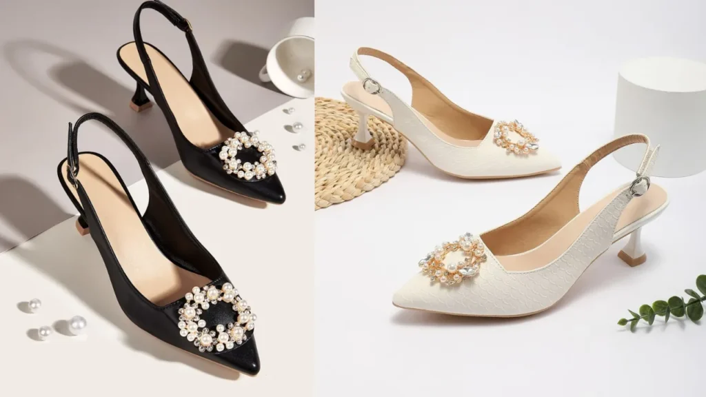 इस तरह की पंप हील्स हर आउटफिट की सुंदरता बढ़ा देते हैं. अगर आपको इस तरह की हील्स पसंद हैं तो आप पर्ल डिजाइन वाली यह हील्स जरूर लें. इन दोनों ही हील्स में पर्ल का ब्रोच बहुत एलिगेंट लग रहा है. ये हील्स भी आपके सभी आउटफिट पर जचेंगी.