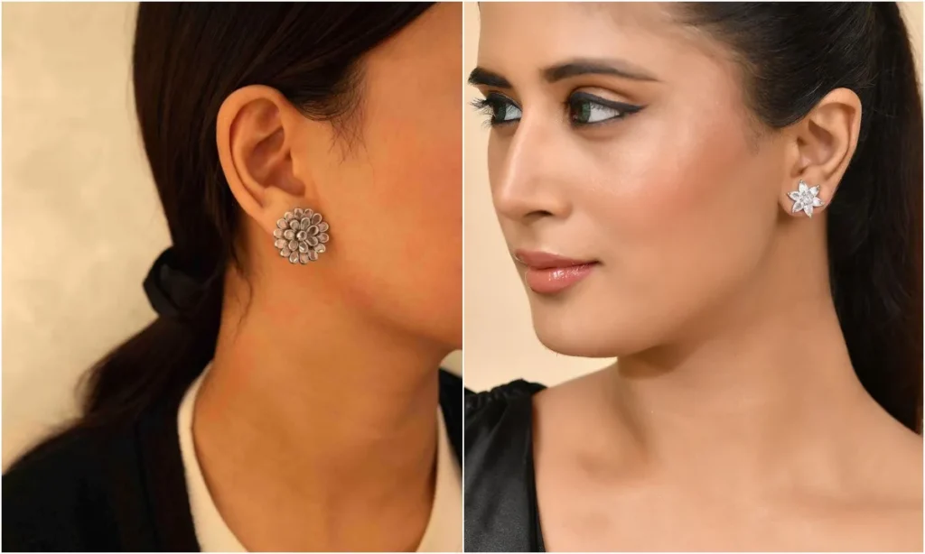 फूलों की शेप वाले ईयररिंग्स हमेशा ही प्यारा और फेमिनिन टच देते हैं. ये काफी लाइटवेट, स्टाइलिश और वर्सटाइल होते हैं. अगर आपको थोड़ा फ्रेश लुक चाहिए, तो इस तरह के सिल्वर इयररिंग्स आपके लिए बेस्ट रहेंगे.