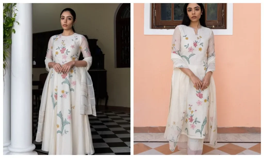 व्हाइट बेस पर रंग-बिरंगे फ्लोरल प्रिंट्स हर किसी का ध्यान खींचते हैं. ये कुर्ता सेट दिन की आउटिंग और ब्रंच डेट्स के लिए भी शानदार चॉइस है. आप किसी भी त्योहार पर इस तरह का लुक ट्राई कर सकती हैं.