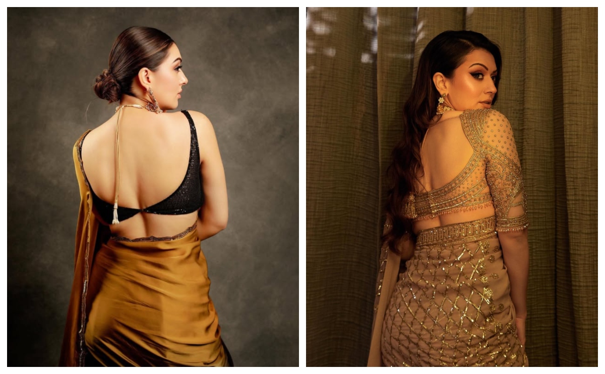 साड़ी में ग्लैमरस दिखने के लिए आप भी हंसिका मोटवानी की तरह बैकलेस ब्लाउज सिलवा सकती हैं. उन्होंने एक ब्लैक और मस्टर्ड कलर की प्लेन साड़ी को सीक्वेंस स्लीवलेस बैकलेस ब्लाउज के साथ पेयर किया. तस्वीरों में उनकी खूबसूरती से नजर हटाका मुश्किल हो रहा है.