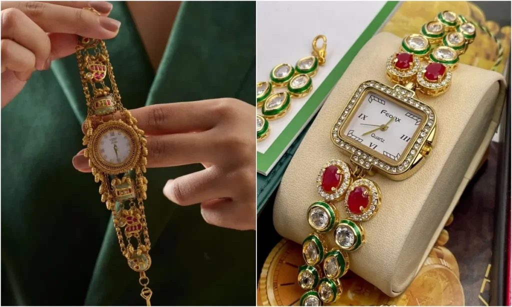 कटवर्क डिजाइन वाली गोल्डन वॉच एकदम जूलरी जैसी लगती है. इस तरह के वॉच ब्रेसलेट कंगन का परफेक्ट मॉडर्न रिप्लेसमेंट है. साथ ही ये आपकी कलाई को रॉयल फील भी देती है. हल्दी, मेहंदी या रिसेप्शन लुक के लिए ये एकदम परफेक्ट है.